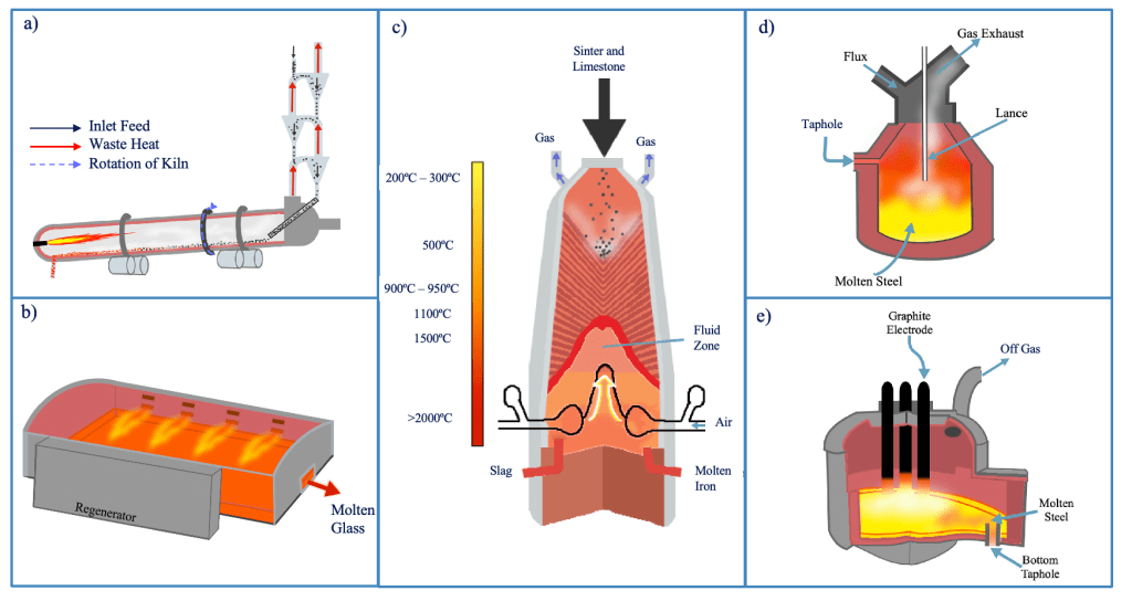 Incumbent industrial kiln and furnace technologies with a) rotary kiln, often used in cement or lime production, b) hearth furnace used in glass making, c) blast furnace used in iron and steel production, d) basic oxygen furnace used in iron and steel production, and e) electric arc furnace used in iron and steel recycling and production.